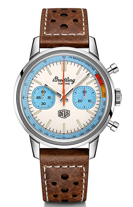 In fact, this Top Time Deus has been announced in different colors once in the past, and like that , it has a lightning bolt-shaped chronograph second hand and the inscription "IN BENZIN VERITAS" on the tachymeter . (Latin literal translation = The truth is in the fuel. It means "you'll know it when you ride it.")