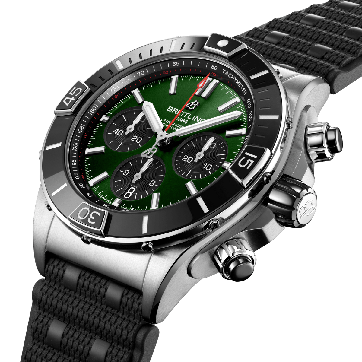 ステンレススチール - グリーン 品番:AB2010121L1A1 ケース径:42㎜ 防水:200m ムーブメント:ブライトリングB20 自社製造 自動巻きムーブメント パワーリザーブ:約70時間 ¥616,000‐ (消費税10%) |