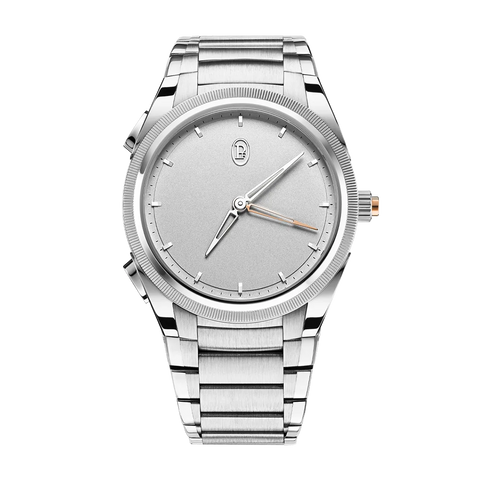 ボタンひとつで、クロノグラフ針と積算計が出現し計測が終了するとまたシンプルな3針へと姿を変えるその機構は圧巻です。