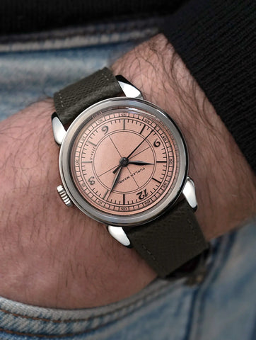 Dennisonが1960年代に生産を終了したその先を受け継ぐように、当時を思わせるクッションケースに、印象的な天然石文字盤とサンレイ文字盤を組み合わせています。
