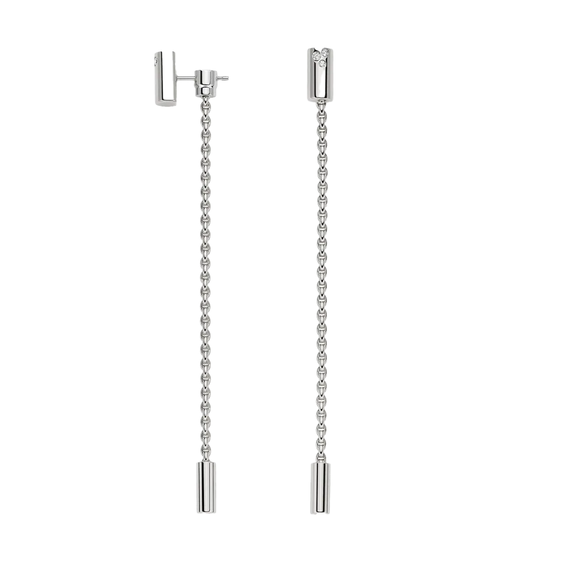 また、耳たぶの後ろ側から下がるロングチェーンのピアスは、後ろから前にループさせたり、取り外してシンプルなスタッドピアスとしても使用できるよう多機能にデザインされています。
