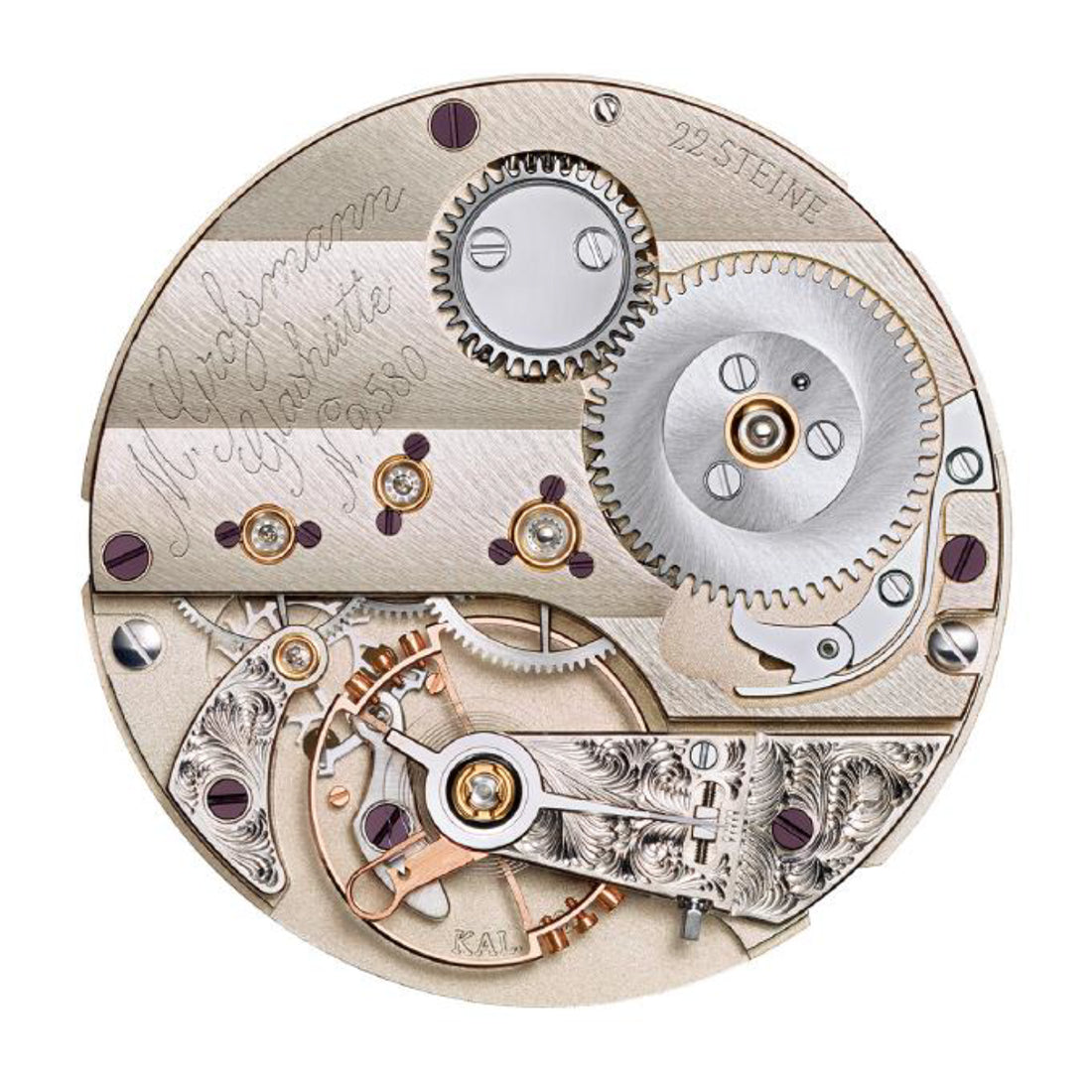 37アラビック ジャパンリミテッドには、3/5プレートと支柱構造を持つクラシカルな小径キャリバー102.1を採用しています。 ケースバック側から見ることのできるムーブメントのプレートには幅広のリブ模様が施され、そこに手彫りされる筆記体のブランド名とグラスヒュッテの文字を美しく際立てます。手巻き、5姿勢調整。