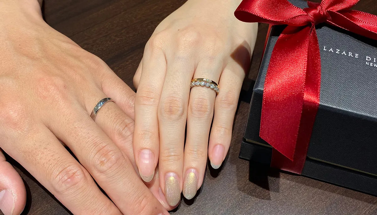 A様この度は、当店にご来店いただき誠にありがとうございました。お二人の大切な指輪選びのお手伝いをさせていただき、これだ!!と思っていただけるお指輪が見つかったこと、とても嬉しく思います✨️男性様は幅太でデザインがしっかり入った男性様らしい「ベットフォード」を、女性様はお持ちの婚約指輪とのコーディネートも素敵で様々な角度からもダイヤモンドの輝きを楽しんでいただける「スリーサイド」をお選びいただきました🌝お近くにお越しの際は指輪のクリーニングなど、ぜひお気軽にお立ち寄りいただければと思います!またお二人にお会いできることを楽しみにお待ちしております♪