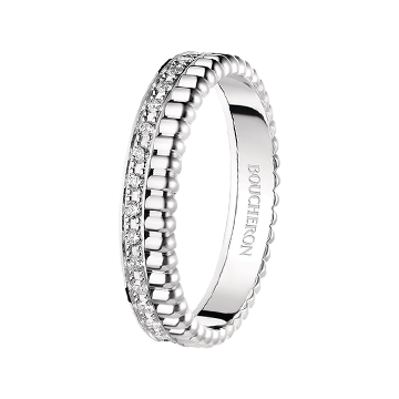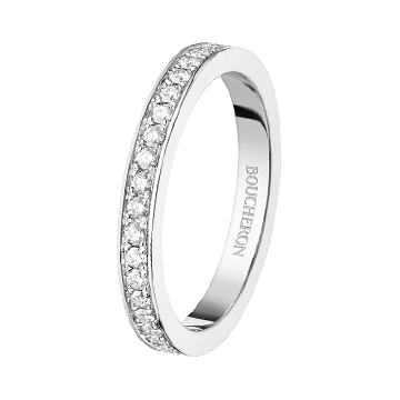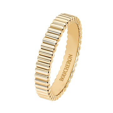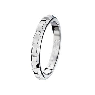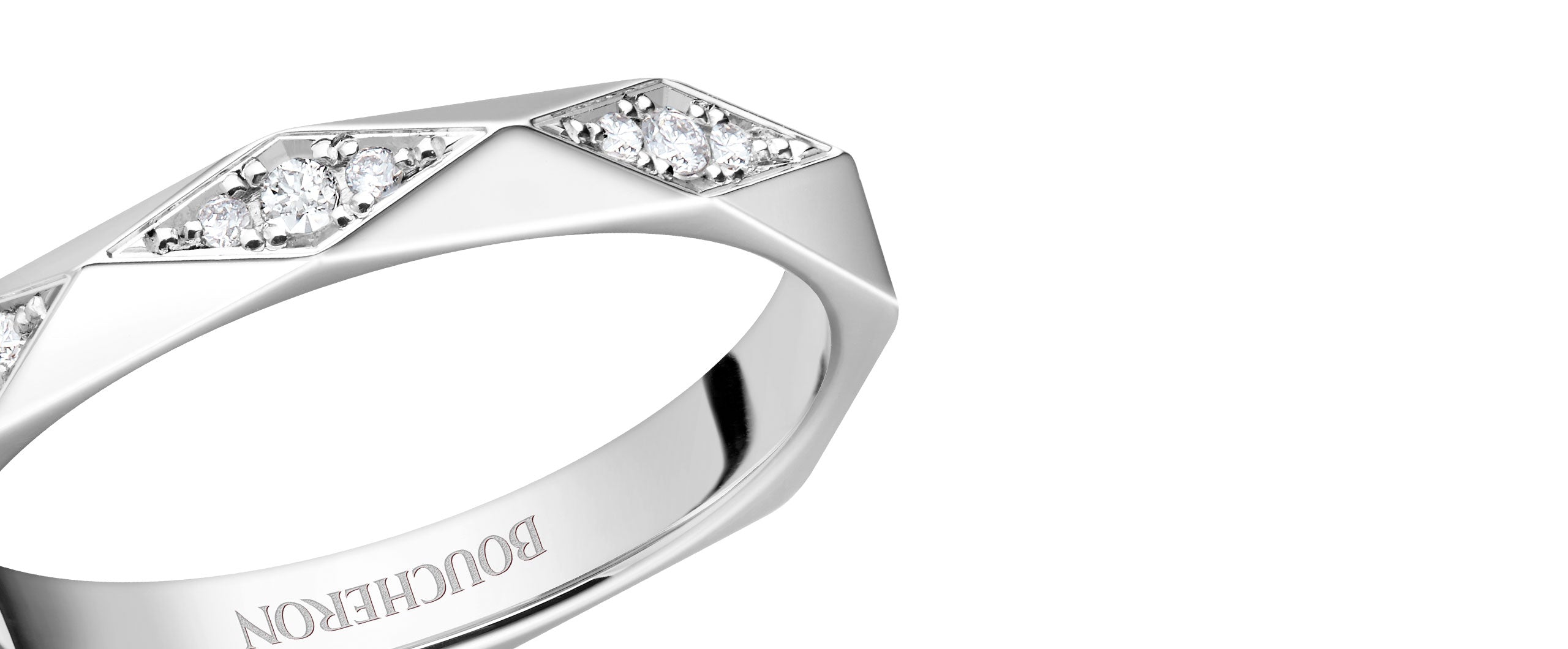 光を反射する幾何学的でシンボリックなファセットのモチーフは、グラフィカルでエレガント。ブシュロンのサヴォワールフェールによって、まるでダイヤモンドのように輝くリングに仕上げられます。シンプルものや洗練されたデザインのリングとの重ね着けをして、自由にコーディネートをお楽しみください。