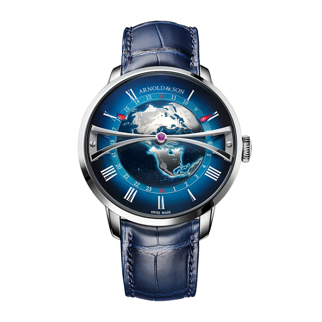 非常に特徴的なこのアーノルド&サン グローブトロッターは、サファイアケースバックから見える自社製自動巻きムーブメントA&S6022を搭載しています。 旅行を愛する人や、複数のタイムゾーンで時間を把握する必要がある人に最適な、素晴らしいタイムピースです。精巧なデザインとクラフトマンシップ、そして実用的な機能性を兼ね備え、美しさと便利さを兼ね備えた仕上がりです。