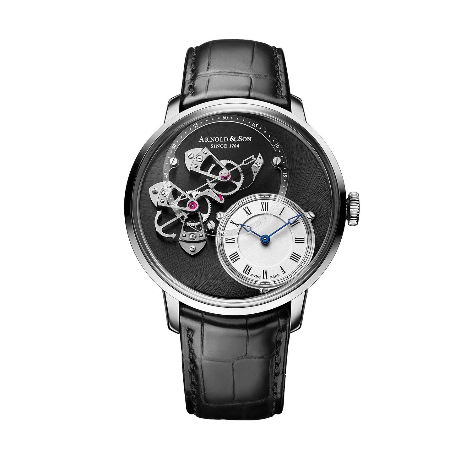 アーノルド&サンDSTBは、ジョン・アーノルドとその子孫が高品質のマリンクロノメーターを大量に製造する方法を開発した、ブランド初期の歴史に敬意を表したコレクションです。DSTBはダイヤルサイド・トゥルー・ビートの略で、アーノルド&サンの伝統的な複雑機構に由来します。DSTBにはジャンピング・デッドビート秒針があり、テンプが1秒間に何度も鼓動している間、針は1回しか動きません。トゥルービートセコンド機構は錨の形をしており、同社の海事産業への関わりを象徴しています。