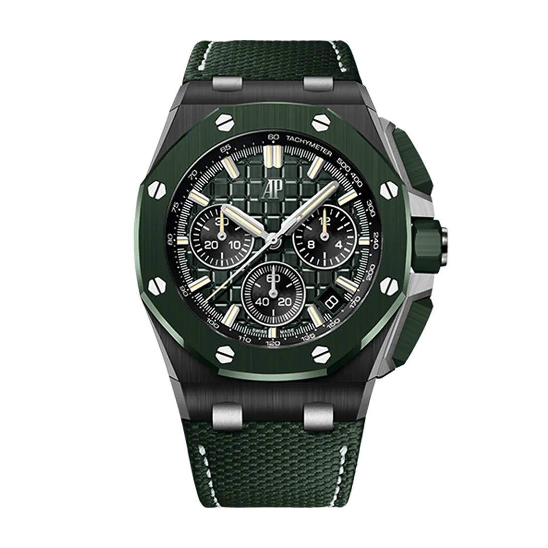 ロイヤル オーク オフショアは、オーデマ ピゲが誇る高級スポーツウォッチで、その美しさと高度な技術が魅力的です。一体成型のデザインや独自技術のメガタぺストリー文字盤など、デザインの洗練度は高く、多くのケース素材のバリエーションも魅力の一つです。さらに、高度な自社ムーブメント技術が採用され、優れた機能性と精度を兼ね備えています。