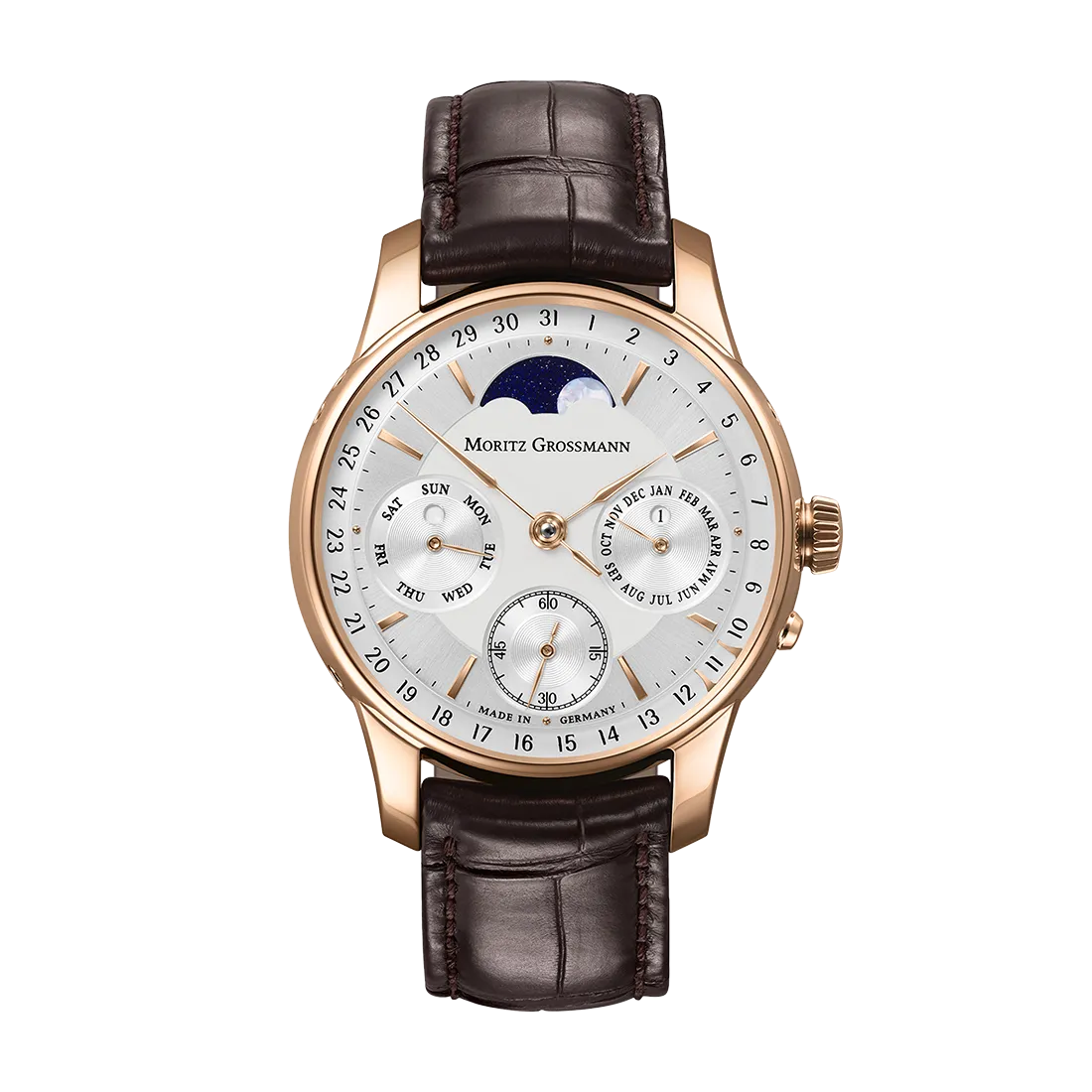 限りなく洗練された姿と真の革新を合わせもつ「テフヌート」。時計作りの優れた品質はその外観とも深く関わることをよく表しています。中央が穏やかに隆起したゴールドのバー・インデックス、6時と12時に入れられたアラビア数字、この時計のためにデザインされ職人が丁寧に手で仕上げた2本の針、そしてゴールドの細身のケースは、自信に満ちた外観を演出するものです。テフヌート・シリーズの洗練されたスタイルをベースに、直径36 mmのエレガントなケースサイズ を採用した「テフヌート レディー」。文字盤のMOPコーティングと6時位置から広がるギョーシェ模様が目を惹きます。ブラウンバイオレットの針によって、モリッツ・グロスマンならではのスタイルを表現しています。