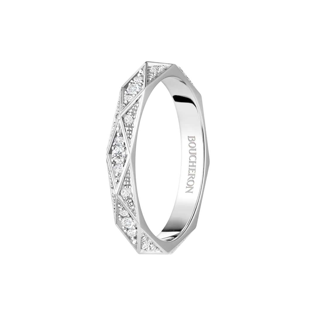 1858年創業、パリ・ヴァンドーム広場にブティックを開いた最初のハイジュエラー「ブシュロン」。世界中の王侯貴族やセレブリティを魅了し続けるクリエイションには、常に最高の品質を追い求めてきた歴史とメゾンに継承されるサヴォワールフェールが息づいています。ブシュロンを象徴する4つのモチーフを彫り込んだ「キャトル」や、誕生以来のロングセラーでもある「セルパンボエム」など、時代を超えて愛され続ける美しいジュエリーの数々を今日も生み出し続けています。 光を反射する幾何学的でシンボリックなファセットのモチーフは、グラフィカルでエレガント。ブシュロンのサヴォワールフェールによって、まるでダイヤモンドのように輝くリングに仕上げられます。シンプルものや洗練されたデザインのリングとの重ね着けをして、自由にコーディネートをお楽しみください。