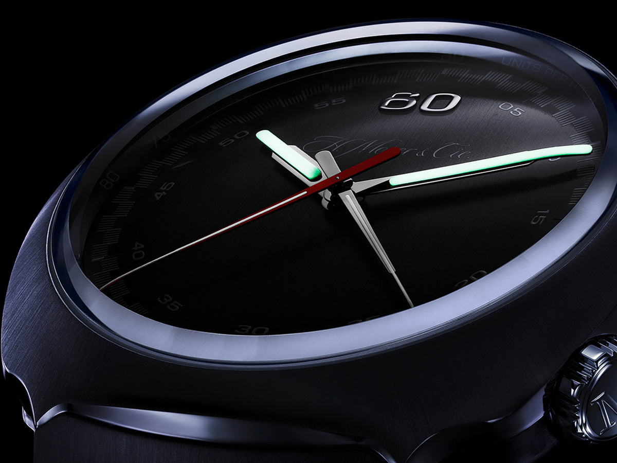 The hour and minute hands are made of the world's first Globolight®, a ceramic compound containing a phosphorescent paint, to achieve high visibility even in dark places. The tip of the chronograph minute and second hand is curved toward the dial, making the numbers easier to read by bringing them closer to the scale. The latest materials and classic techniques are used even in small parts, further increasing the value of the Streamliner.