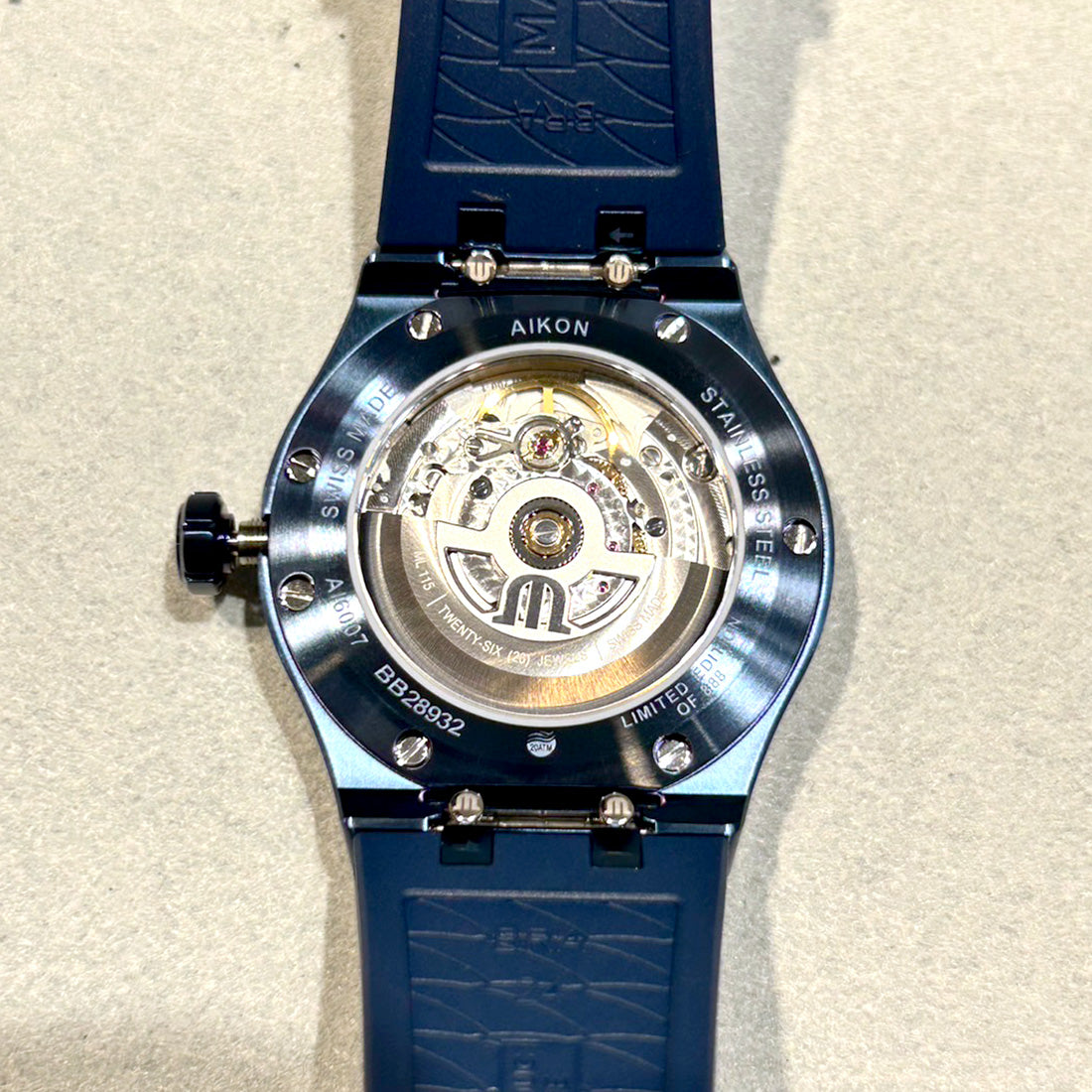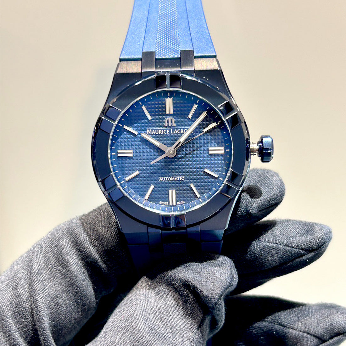 | 素材 | ケース素材: ブルーPVD加工ステンレススチール ダイアル: ブルー, クル・ド・パリ装飾 ストラップの素材: ブルー, ラバーストラップ, モーリス・ラクロアの「m」ロゴが特徴 イージーストラップ交換システムあり ピンバックル |