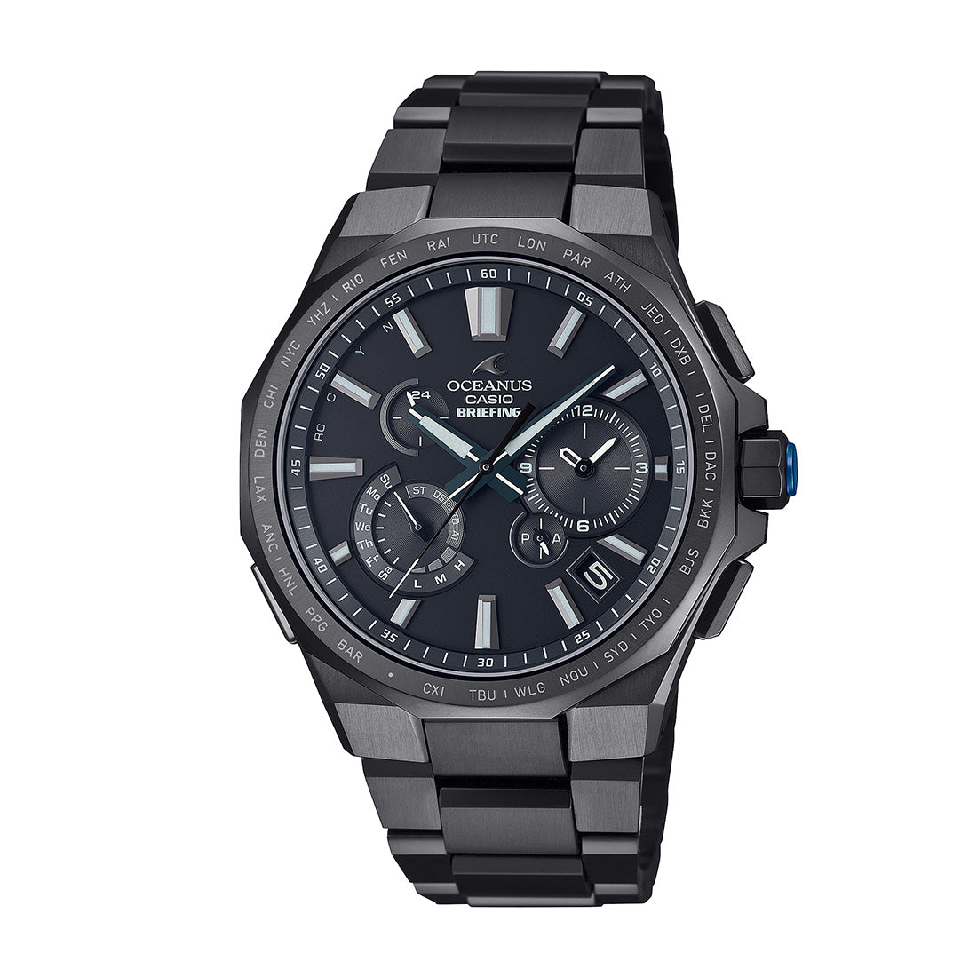 カシオの中ではメイド・イン・ジャパン最高級ラインのオシアナスですが、今回は雰囲気をかえたオールブラック仕様で上品にリューズにセッティングされたオシアナスブルーと、ベゼル下部に密かに入れられたDELTAシリーズのレッドライン。ブレスレットのバックルにも文字刻印が施されています。