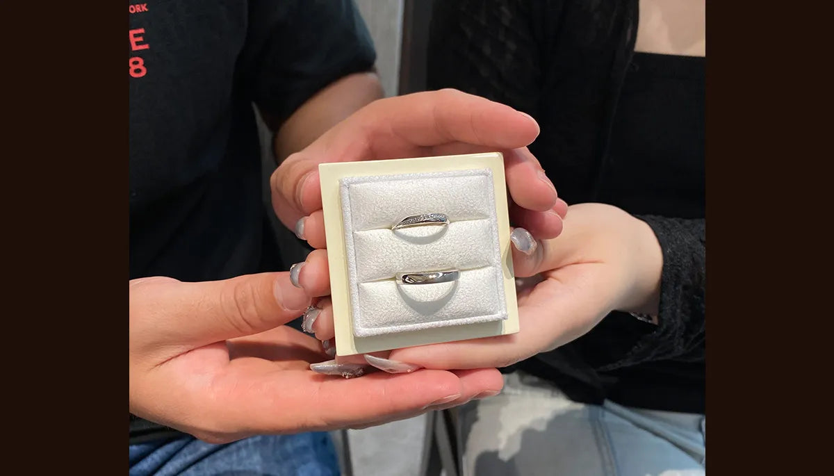 M様 A様この度は、当店にご来店いただき誠にありがとうございました。お二人の大切な指輪選びのお手伝いをさせていただき、お二人にぴったりな指輪が見つかったこと、とても嬉しく思います✨️お選びいただいたご結婚指輪は、シチュエーションによって正面の見え方を変えて、ご着用いただけるデザインです💍ぜひ、様々な見え方をお楽しみください🌝指輪のクリーニングなど、ぜひお気軽にお立ち寄りいただければと思います!またお二人にお会いできることを楽しみにお待ちしております!