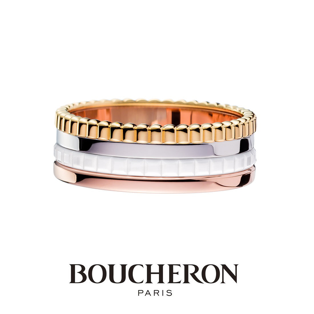 A novel combination of different golds and textures. Boucheron's representative Quatre is a collection that reinterprets and gives new life to the Maison's traditional motifs. The brilliance of the Quatre White Ring is reminiscent of the history of Jeweler Boucheron, which shines brilliantly in Paris, the City of Light. The creamy texture of the uniquely developed white ceramic adds elegance and a gentle sweetness to the shine.