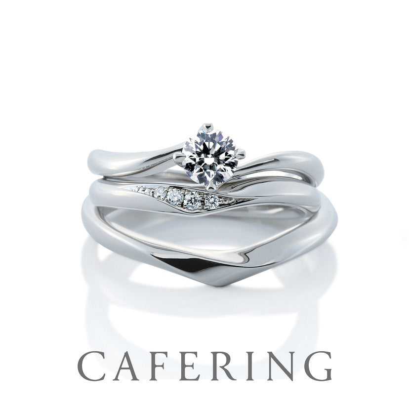 CAFERING's bridal rings feature elegant and lovely designs that make your fingers look beautiful. We carefully create our products with "suppleness" and "lightness" so that you can use them comfortably every day. The engagement ring is designed so that the stone seat of the center diamond is slightly held down so that it does not get caught. In addition, the platinum claws that hold the diamonds are beautifully designed in detail by skilled craftsmen so that the diamonds emit the most beautiful brilliance. Wedding rings can be customized according to your style and taste, so you can enjoy choosing a ring regardless of gender.