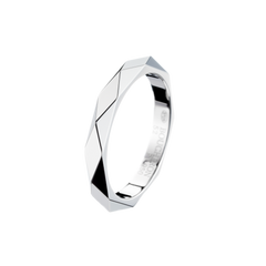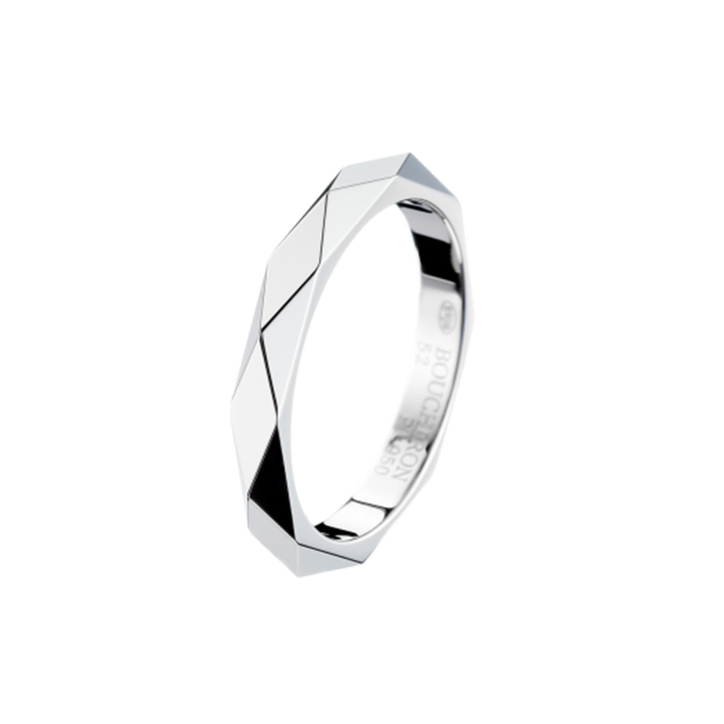 Boucheron's emblematic faceted motif evokes the faceted cut typical of diamonds. The contemporary design evokes the dazzling facets of diamonds. The fine polishing of platinum gives the ring a bright shine, and the 3 diamonds bring even more brilliance. The facets of sophistication and charm symbolize a vow of everlasting love.