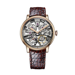 ケース:18カラットのレッドゴールド(5N) ダイヤル:ロジウム処理チャプターリング ストラップ:手縫いのブランデーまたはグレーのアリゲーターレザー |