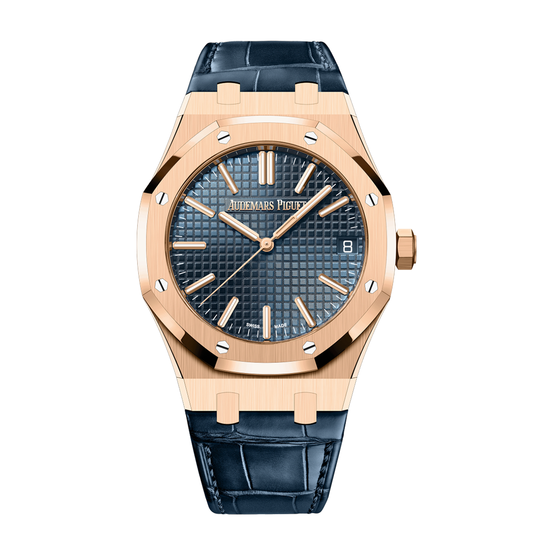 The dial of the 41mm Royal Oak Automatic in 18K pink gold is the 'Grand Tapisserie' of the famous 'Night Blue, Cloud 50 Colors' of the 1972 original. Combined with a color-matched alligator strap. It also keeps up with the latest design evolutions in the collection.