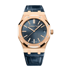 pink gold Dial: “Night Blue, Cloud 50” dial with “Grande Tapisserie” pattern, pink gold applied hour-markers and Royal Oak hands with luminescent coating. bracelet: Blue alligator strap with 18K pink gold AP folding clasp. |