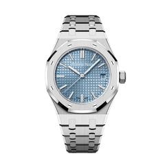 steel Dial: Light blue dial with “Grande Tapisserie” pattern, white gold applied hour-markers and Royal Oak hands with luminescent coating. bracelet: Stainless steel bracelet, AP folding clasp. |