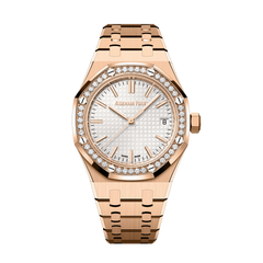 pink gold Setting: 40 brilliant-cut diamonds, ~0.92 carat (bezel). Dial: Silver-toned dial with “Grande Tapisserie” pattern, pink gold applied hour-markers and Royal Oak hands with luminescent coating. bracelet: 18K pink gold bracelet with AP folding clasp. |