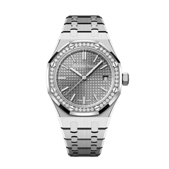 Steel Setting: 40 brilliant-cut diamonds, ~0.92 carat (bezel). Dial: Gray dial with “Grande Tapisserie” pattern, white gold applied hour-markers and Royal Oak hands with luminescent coating. bracelet: Stainless steel bracelet, AP folding clasp. |