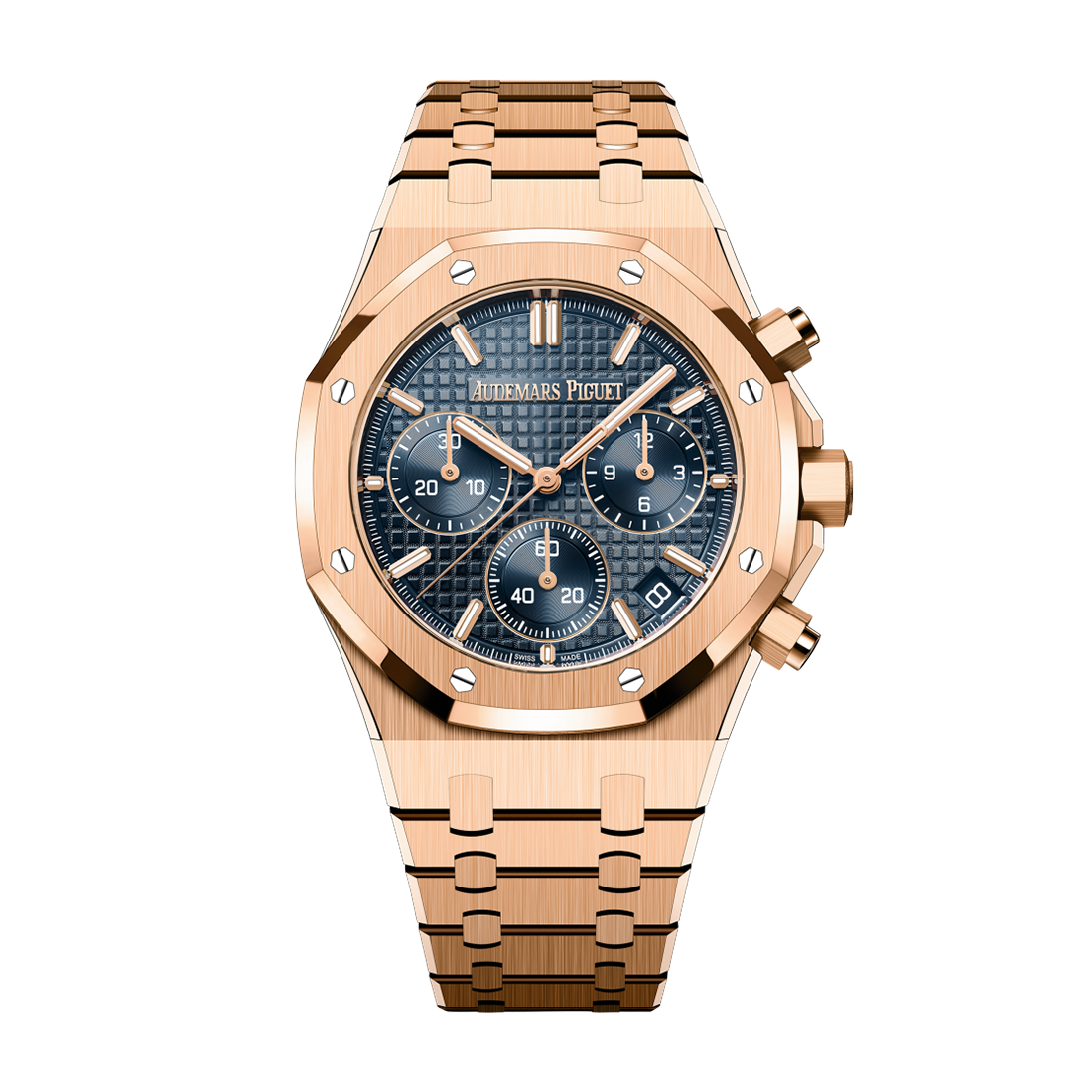pink gold Dial: “Night Blue, Cloud 50” dial with “Grande Tapisserie” pattern, “Night Blue, Cloud 50” counters, pink gold applied hour-markers and Royal Oak hands with luminescent coating. bracelet: 18K pink gold bracelet with AP folding clasp. |