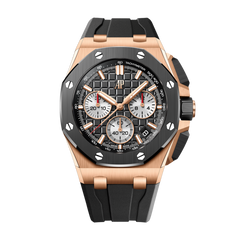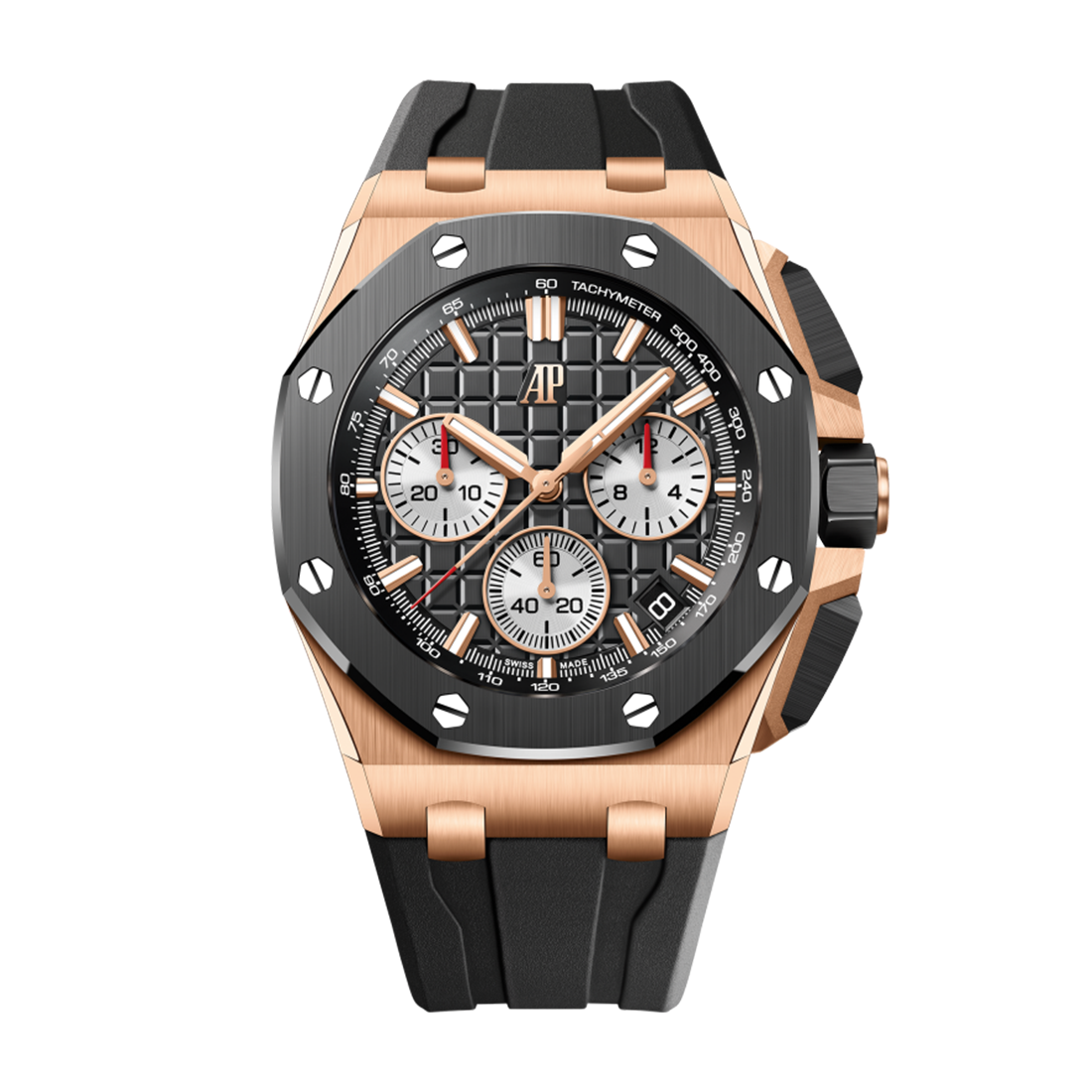 18-carat pink gold case, glareproofed sapphire crystal and caseback, black ceramic bezel, pushpieces and screw-locked crown, sandblasted 18-carat pink gold pushpiece guards Dial: Black dial with “Méga Tapisserie” pattern, rhodium-toned counters and outer zone, pink gold applied hour-markers and Royal Oak hands with luminescent coating, black inner bezel bracelet: Interchangeable black rubber strap with 18K pink gold AP pin buckle. Black alligator strap included |