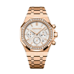 This 38mm chronograph features a pink gold case and bracelet with a diamond-set bezel and a silver-tone "Grande Tapisserie" dial. A slender watch that incorporates the evolution of the new Royal Oak design.