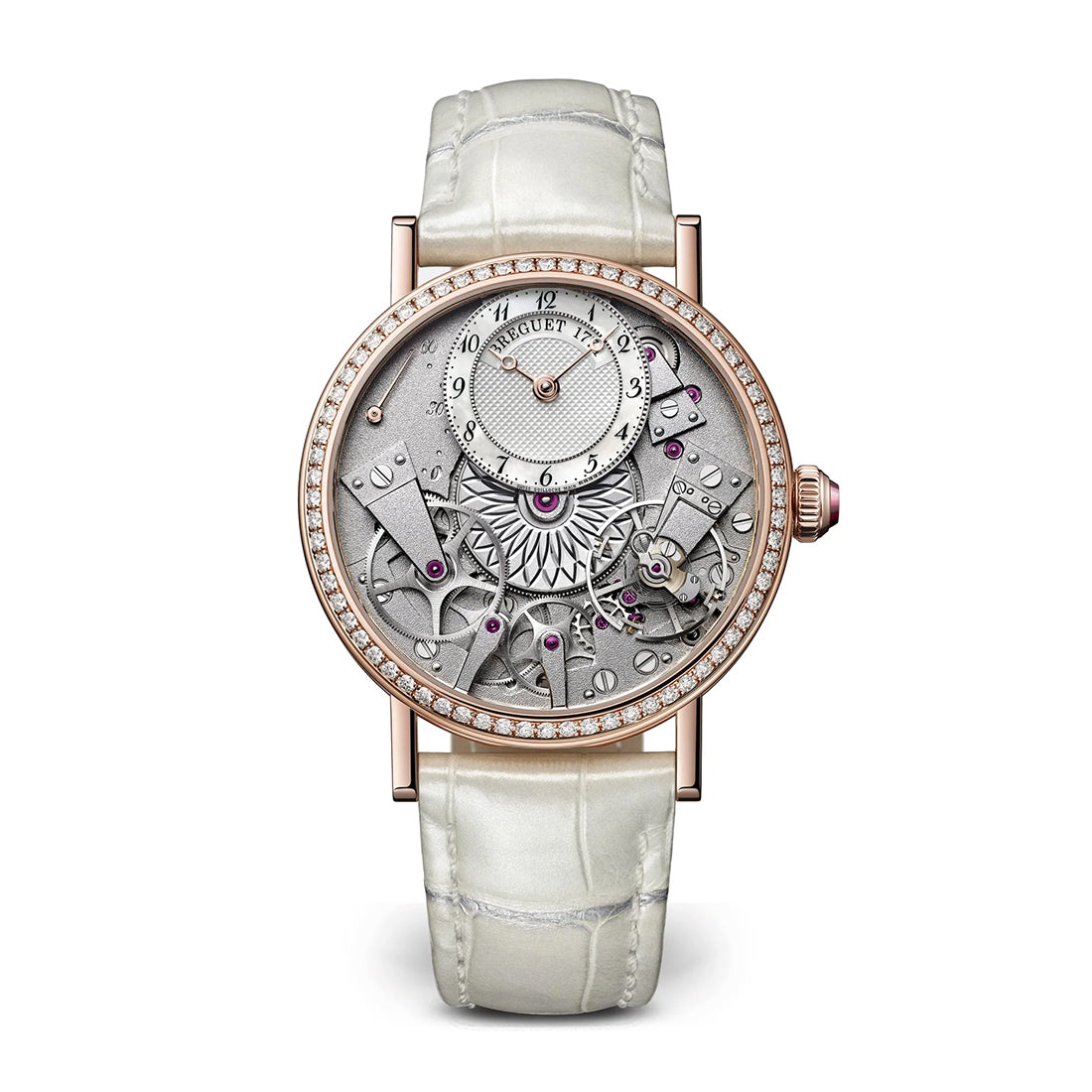 Dial Natural mother-of-pearl dial, hand-engraved guilloché, offset at 12 o'clock. Individually numbered and signed by Breguet. Arabic numeral chapter ring. Gold Breguet hands.