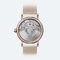 Artificial ruby on the crown <br>Natural mother of pearl dial <br>Inverted in-line lever escapement with silicone anchor <br>Silicon balance spring <br>Sapphire case back (transparent case back) alligator strap <br>Gold pin buckle set with 19 brilliant diamonds (~0.135 carat) |