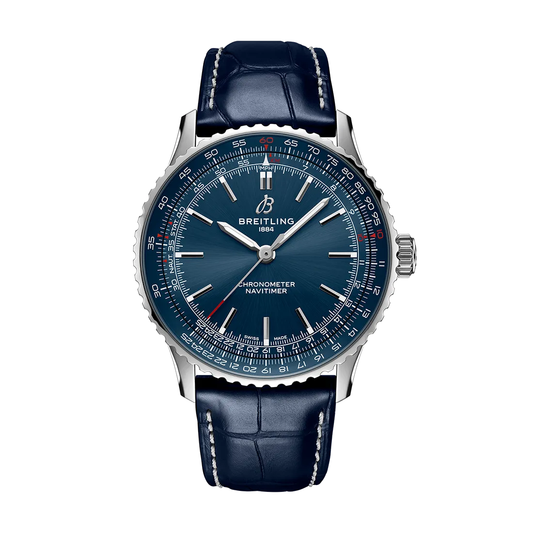 「ナビタイマーオートマチック 41」と「ナビタイマー オートマチックGMT 41」は、クロノグラフを省きながらもバランスの取れた文字盤構成を保ち、このアイコニックな外観を凝縮しています。 GMTでは 24時間スケールを中央に配置し、オートマティックではすっきりとした文字盤を採用することで、複雑な計算尺を際立たせながら、全体的な美しさを引き締めています。
