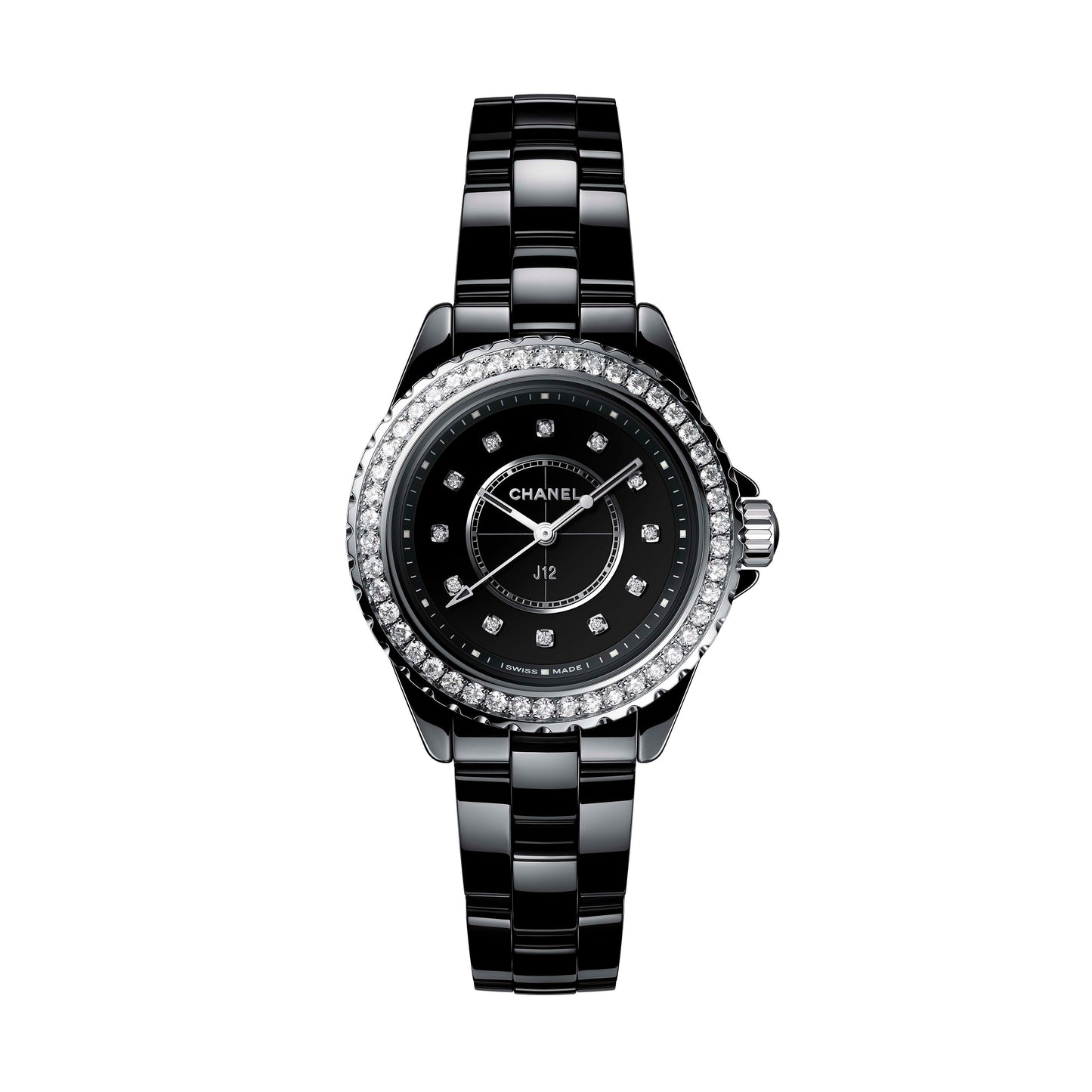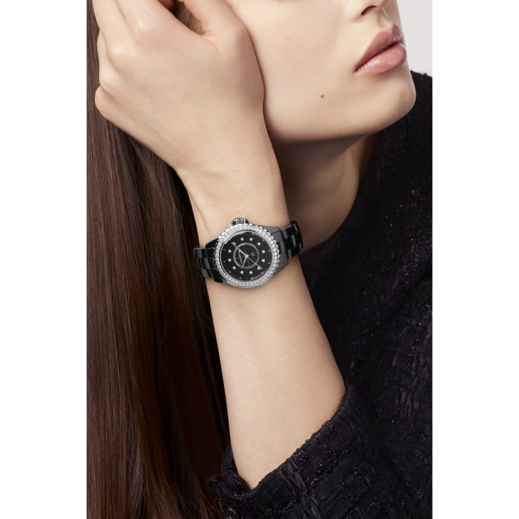 Dial: Black lacquer dial with 12 diamond indexes (~0.06 carat) Crown: Non-screwed crown, stainless steel, highly resistant black ceramic cabochon <br>Bracelet: highly resistant black ceramic, stainless steel triple folding buckle |
