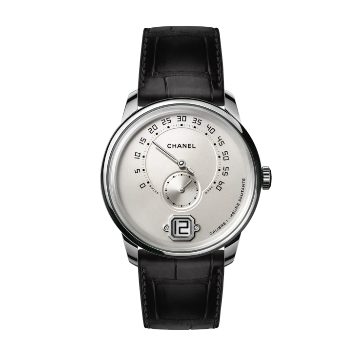 | その他特徴 | Case: 18K white gold <br>Dial: Opal ivory color dial, retrograde minute display, jumping hour, small seconds <br>Crown: 18K white gold <br>Bracelet: Black alligator pattern calfskin strap, 18K white gold buckle |