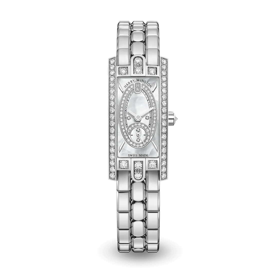 The "HW Avenue C Mini Small Seconds" is characterized by an oval-motif dial decorated with glittering diamonds. Housed in an elegant 18K gold case, this timepiece exudes feminine charm.