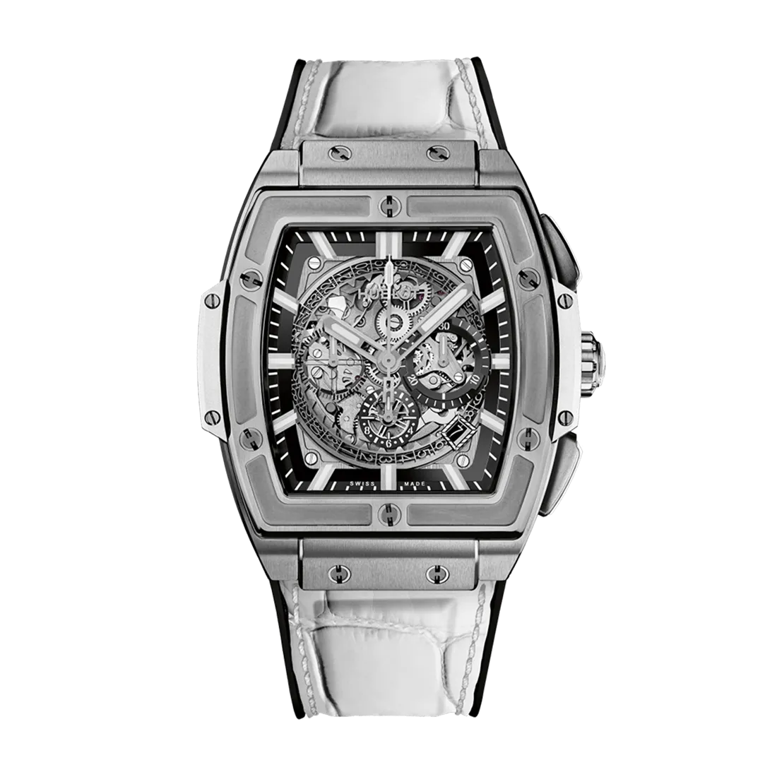 | 素材 | Case: Satin-finished Titanium <br>Bezel: Satin-finished and Polished Titanium with 6 H-shaped Titanium Screws <br>Strap: White alligator and black rubber strap with black stitching <br>Clasp: Titanium |