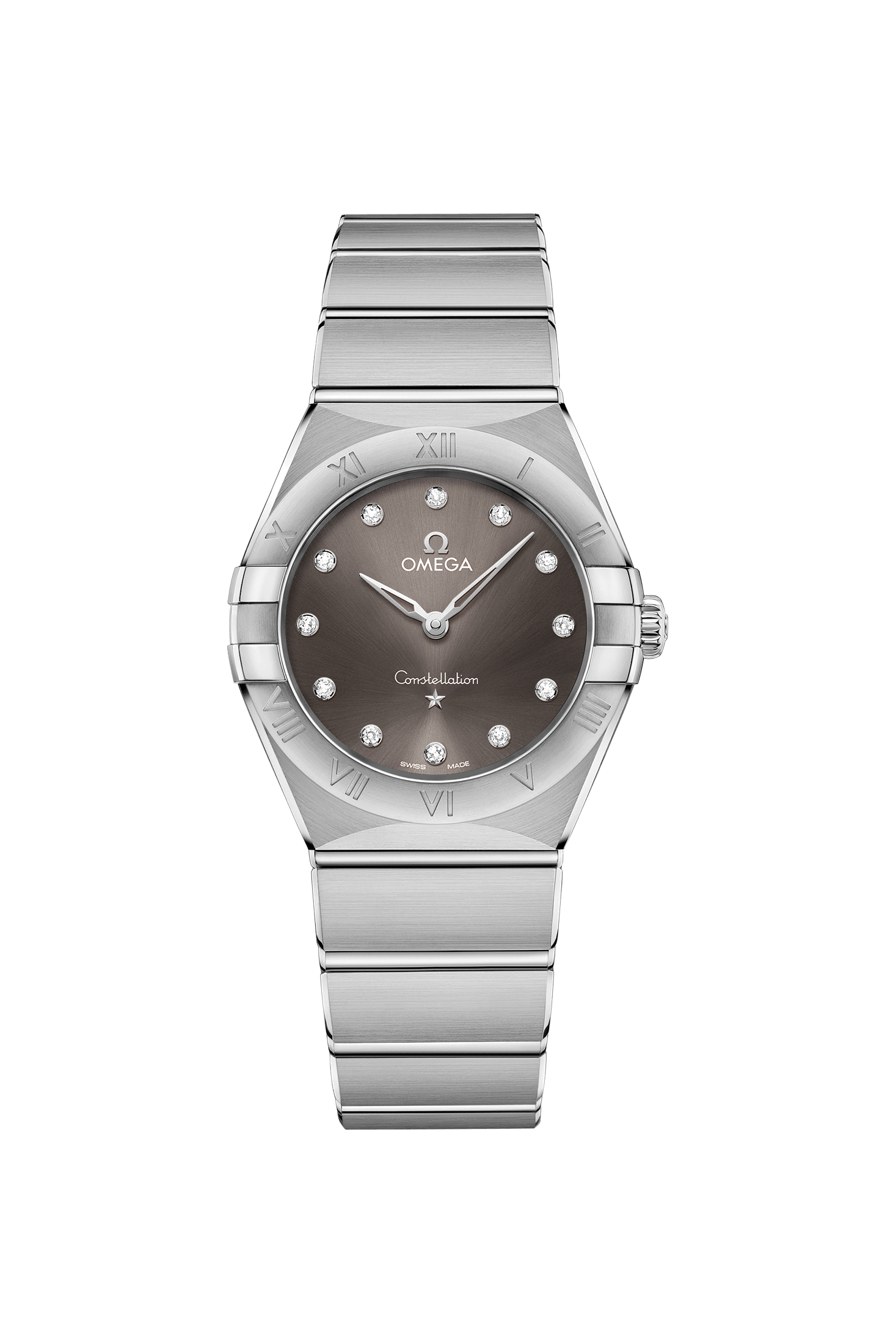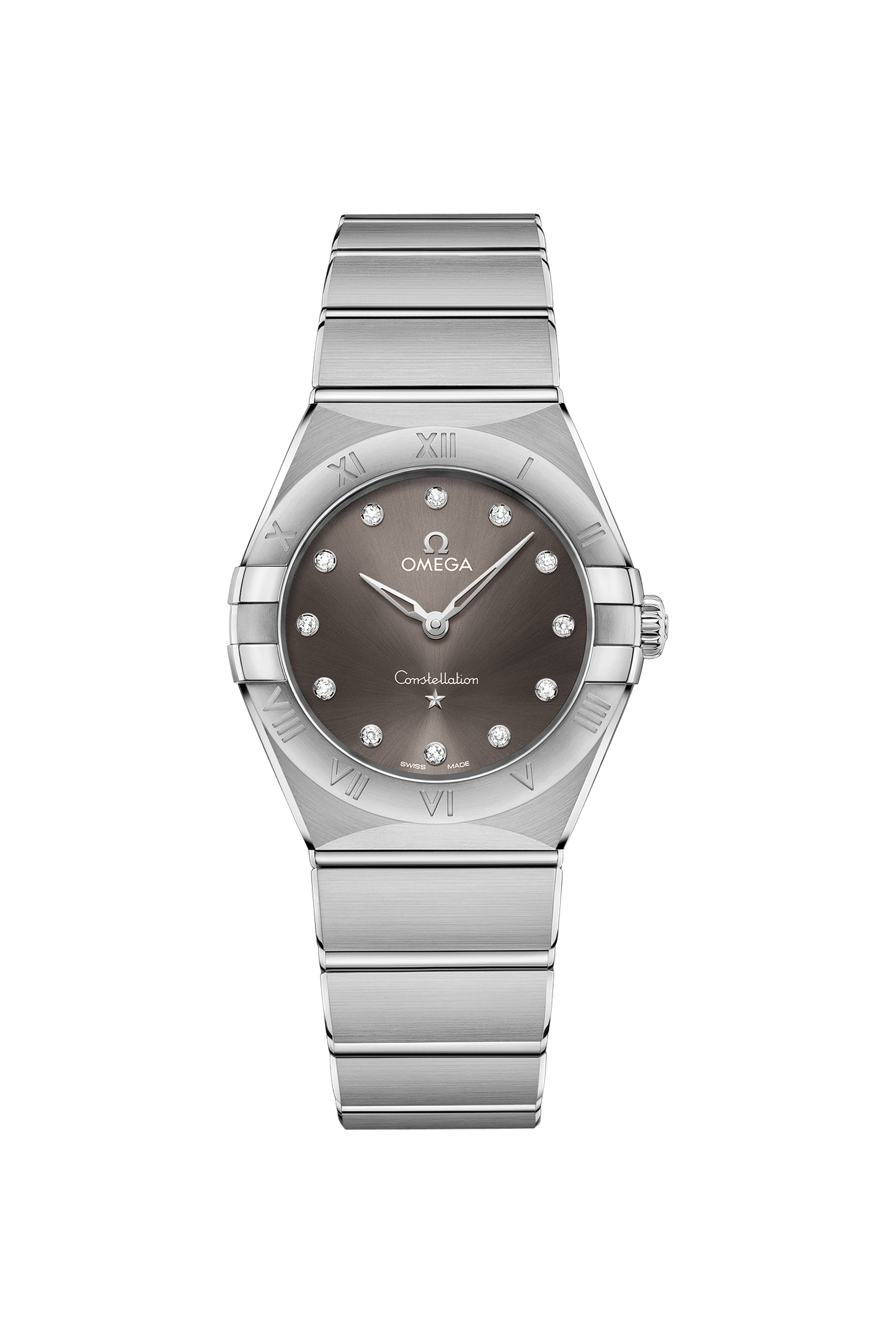 This 28 mm stainless steel model features a bezel engraved with Roman numerals and a sun-brushed gray dial with diamond indices. It features a scratch-resistant sapphire crystal glass. The hands, OMEGA logo, Constellation star and diamond index bezel are crafted from 18K white gold.