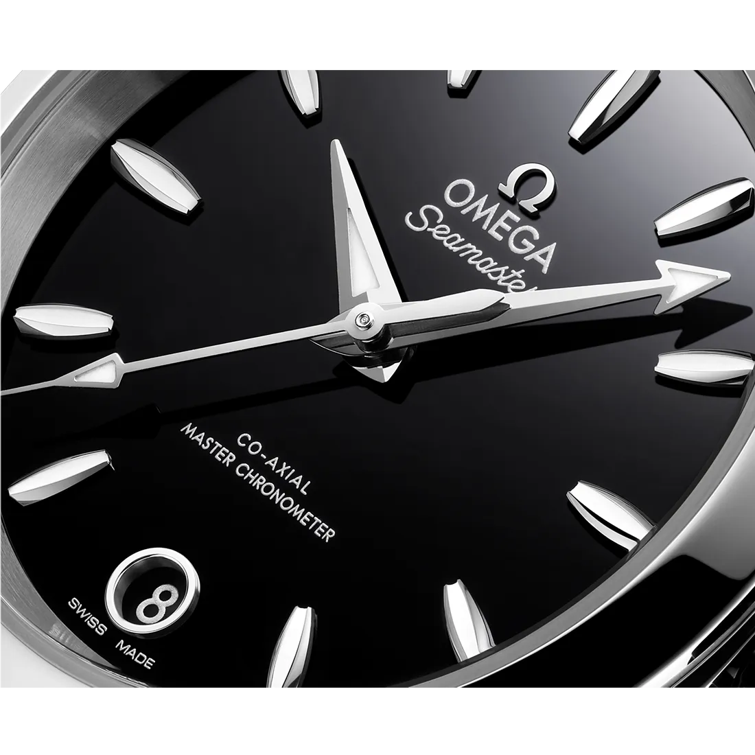 ブラックのニスを塗布し、ラッカー仕上げを施したダイアルには、ダイヤモンドでポリッシュしたホワイトゴールドのオメガロゴと、6時位置には日付窓を配しています。針と、ヨットの船体を象ったインデックスも同じく、ダイヤモンドポリッシュで仕上げたホワイトゴールド製で、ブルーに発光するホワイトのスーパールミノヴァを塗布しています。