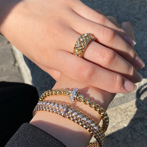 5つのコアコレクション(Prima、Solo、Eka、Vendôme、Panorama)から発売される、新しいマストハブコレクション。 FOPEのシグネチャーである伸縮するブレスレットのコンセプトを共有しながら、ブランドのDNAに基づいて再設計されました。 ブレスレットにセットされたプレーンゴールドのロンデルには、FOPEの「o(オー)」に1粒のホワイトまたはブラックダイヤモンドがセットされています。さりげないアクセントは、男性と女性の両方にアピールします。