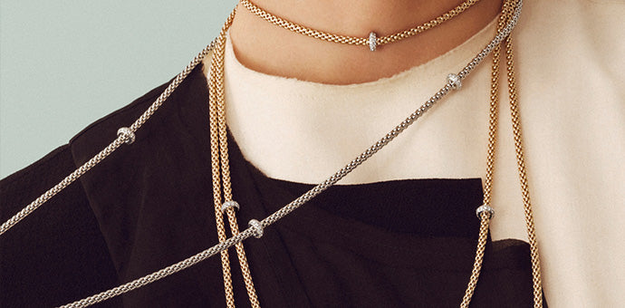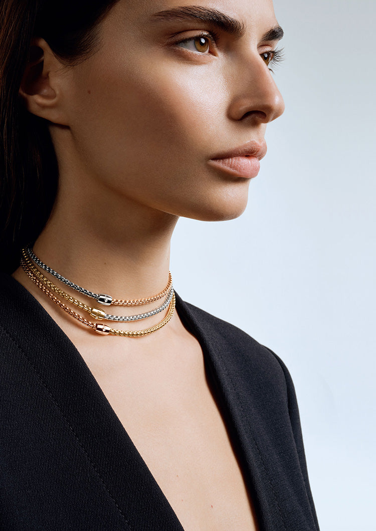 2010年に発表されたソロコレクションは、現在もなお人気を博し続けているFOPEコレクションの一つです。 発表以来、18Kゴールド製ラウンドメッシュチェーンを採り入れたアイテムが少しずつ加わり、さまざまなカラーやスタイルの組み合わせをお楽しみいただけるようになりました。柔軟性に富むブレスレットのゴールドメッシュには、ゴールド製ループやサイズの異なるダイヤモンドをあしらった数々のバージョンも加わりました。 揃いのネックレスやイヤリング、リングもご用意しています。