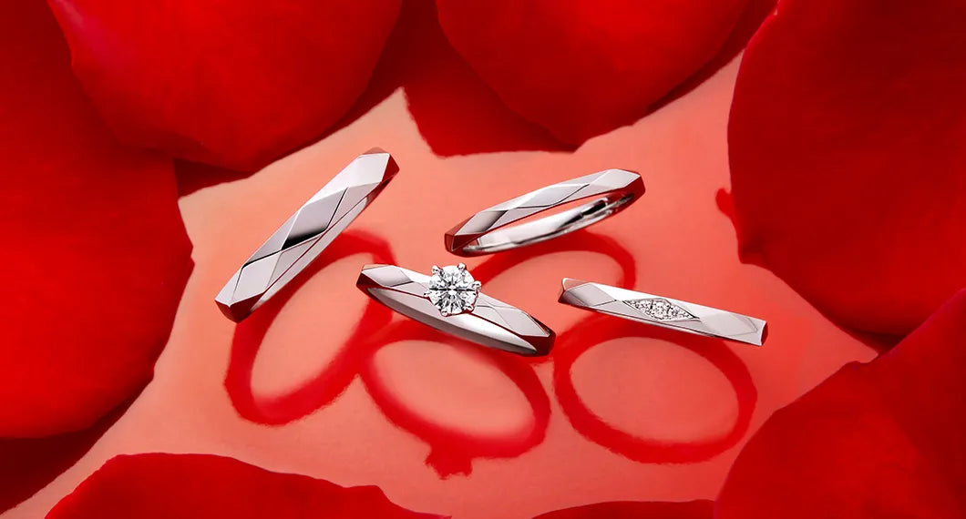 シンプルながらこだわりが詰まったリング。着けた時に見える横顔が素敵なデザインです。ゆびわ言葉には『真っ白なこれからを、ふたりだけの“しあわせ色”が彩っていきますように。』という想いが込められています。