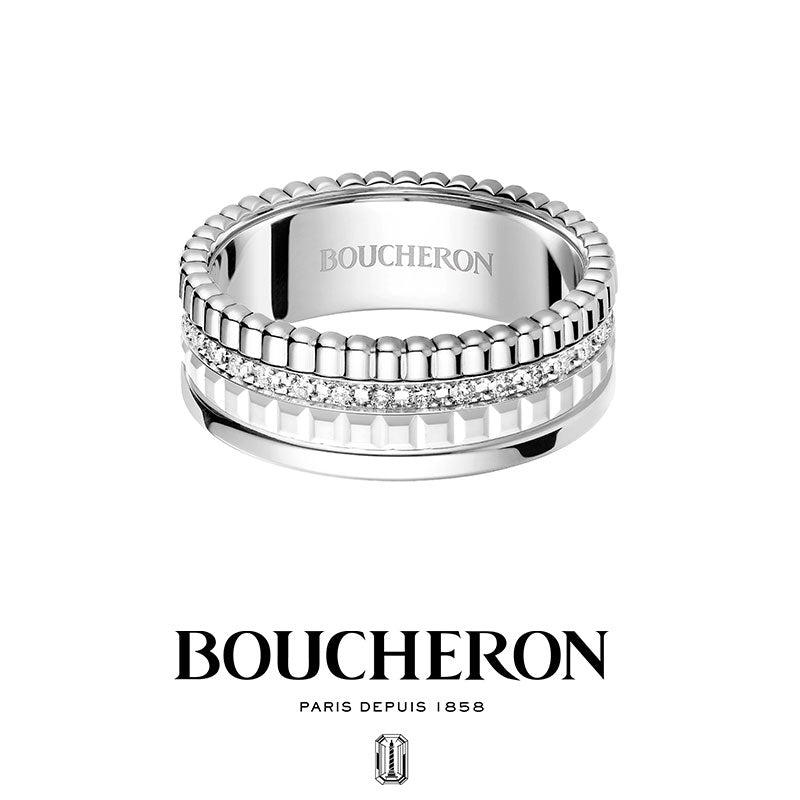 愛のジュエラーから受け継がれる愛のジュエリー「BOUCHERON」ファッションの聖地パリで160年以上も5大宝飾ブランドのひとつとして君臨する由緒あるハイジュエラーです。シンプルながらも、ひねりを加えたそのデザインは繊維業を営む家庭に生まれ育った創業者であるフレデリック・ブシュロンならでは。幼少期から慣れ親しんだレースやシルクのなめらかさをゴールドや宝石で表現。自由で独創的な発想のデザインで個性を出せるブライダルリングとして世界中の人々を虜にしています。
