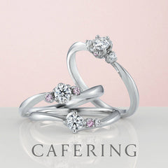CAFERING のブライダルリングは、指が美しく見える上品で愛らしいデザインが特徴。毎日心地良くご愛用いただけるよう、「しなやかさ」と「軽やかさ」を大切におつくりしています。 婚約指輪では、センターダイヤモンドの石座を少し抑え目に、ひっかかりがないように設計。さらに、ダイヤモンドが最も美しい輝きを放つよう、ダイヤモンドを留めるプラチナの爪も熟練職人の技術により細部まで美しくデザインされています。 結婚指輪は、スタイルやお好みに合わせてデザインを選び、カスタマイズもできるので、男女問わずリング選びをお楽しみいただけます。