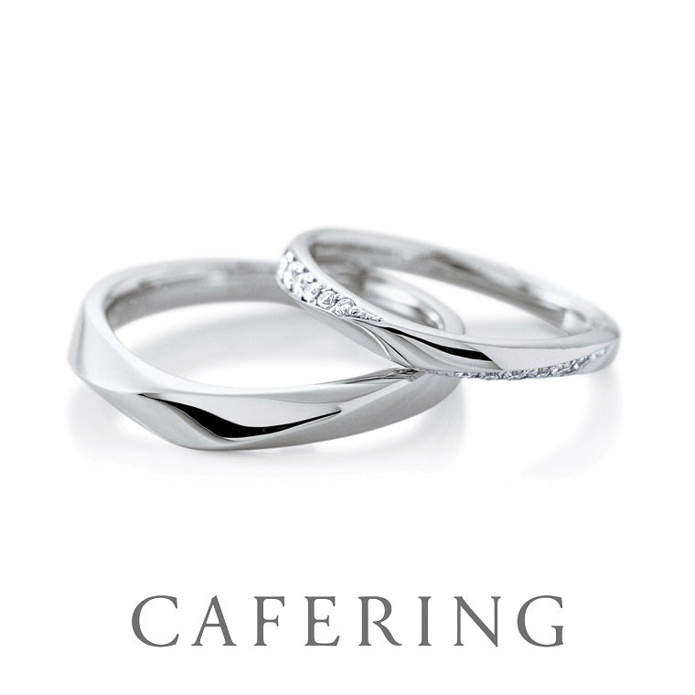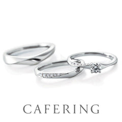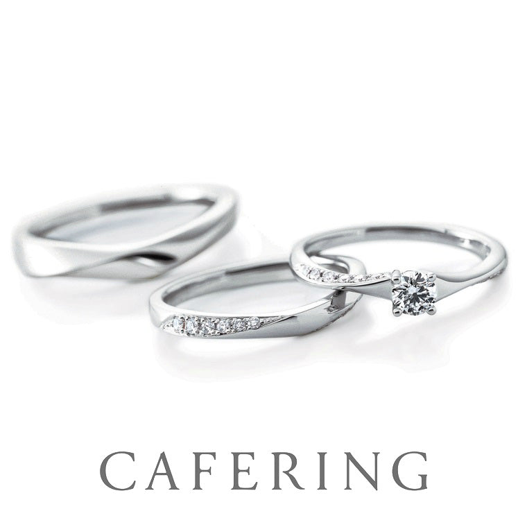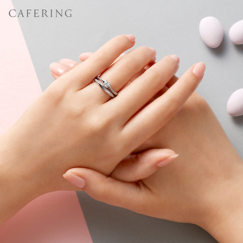 CAFERING のブライダルリングは、指が美しく見える上品で愛らしいデザインが特徴。毎日心地良くご愛用いただけるよう、「しなやかさ」と「軽やかさ」を大切におつくりしています。 婚約指輪では、センターダイヤモンドの石座を少し抑え目に、ひっかかりがないように設計。さらに、ダイヤモンドが最も美しい輝きを放つよう、ダイヤモンドを留めるプラチナの爪も熟練職人の技術により細部まで美しくデザインされています。 結婚指輪は、スタイルやお好みに合わせてデザインを選び、カスタマイズもできるので、男女問わずリング選びをお楽しみいただけます。