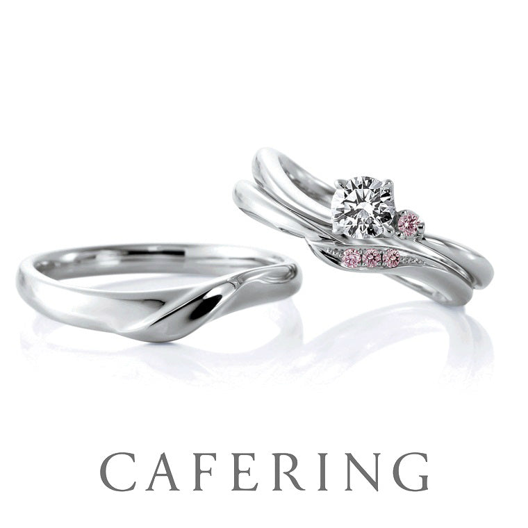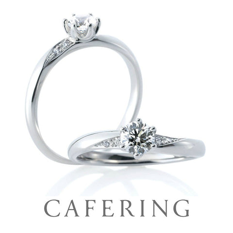 CAFERING のブライダルリングは、指が美しく見える上品で愛らしいデザインが特徴。毎日心地良くご愛用いただけるよう、「しなやかさ」と「軽やかさ」を大切におつくりしています。 婚約指輪では、センターダイヤモンドの石座を少し抑え目に、ひっかかりがないように設計。さらに、ダイヤモンドが最も美しい輝きを放つよう、ダイヤモンドを留めるプラチナの爪も熟練職人の技術により細部まで美しくデザインされています。 結婚指輪は、スタイルやお好みに合わせてデザインを選び、カスタマイズもできるので、男女問わずリング選びをお楽しみいただけます。