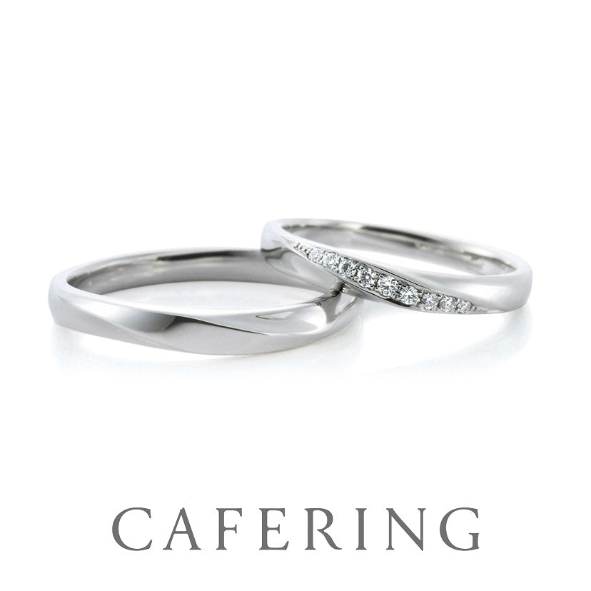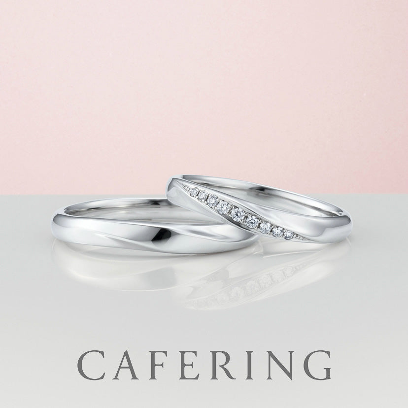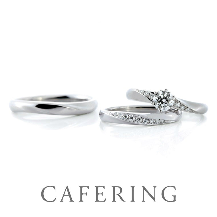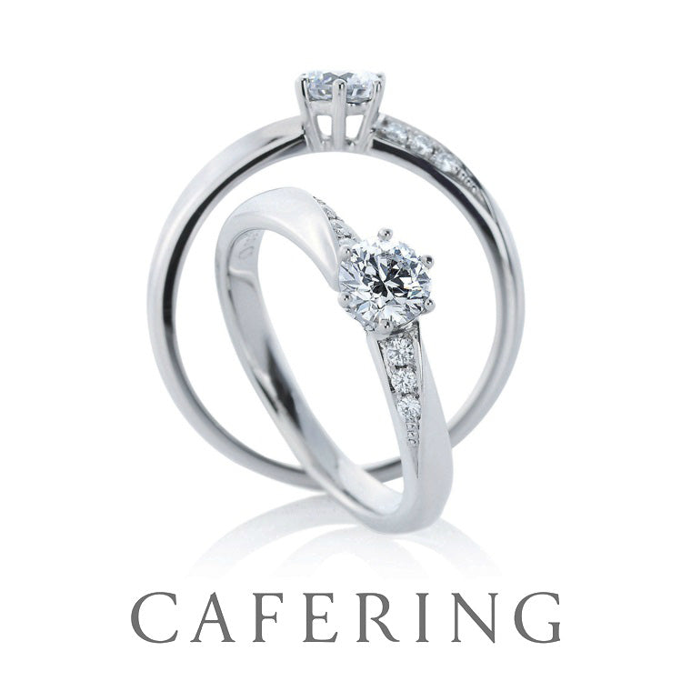 CAFERING のブライダルリングは、指が美しく見える上品で愛らしいデザインが特徴。毎日心地良くご愛用いただけるよう、「しなやかさ」と「軽やかさ」を大切におつくりしています。 婚約指輪では、センターダイヤモンドの石座を少し抑え目に、ひっかかりがないように設計。さらに、ダイヤモンドが最も美しい輝きを放つよう、ダイヤモンドを留めるプラチナの爪も熟練職人の技術により細部まで美しくデザインされています。 結婚指輪は、スタイルやお好みに合わせてデザインを選び、カスタマイズもできるので、男女問わずリング選びをお楽しみいただけます。