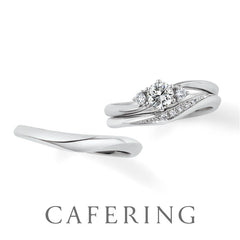 CAFERING のブライダルリングは、指が美しく見える上品で愛らしいデザインが特徴。毎日心地良くご愛用いただけるよう、「しなやかさ」と「軽やかさ」を大切におつくりしています。 婚約指輪では、センターダイヤモンドの石座を少し抑え目に、ひっかかりがないように設計。さらに、ダイヤモンドが最も美しい輝きを放つよう、ダイヤモンドを留めるプラチナの爪も熟練職人の技術により細部まで美しくデザインされています。 結婚指輪は、スタイルやお好みに合わせてデザインを選び、カスタマイズもできるので、男女問わずリング選びをお楽しみいただけます。