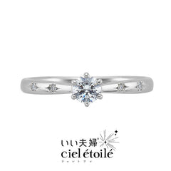 シンプルで定番のソリティアのアームに星の輝きをイメージしたメレダイヤを散りばめたデザイン。