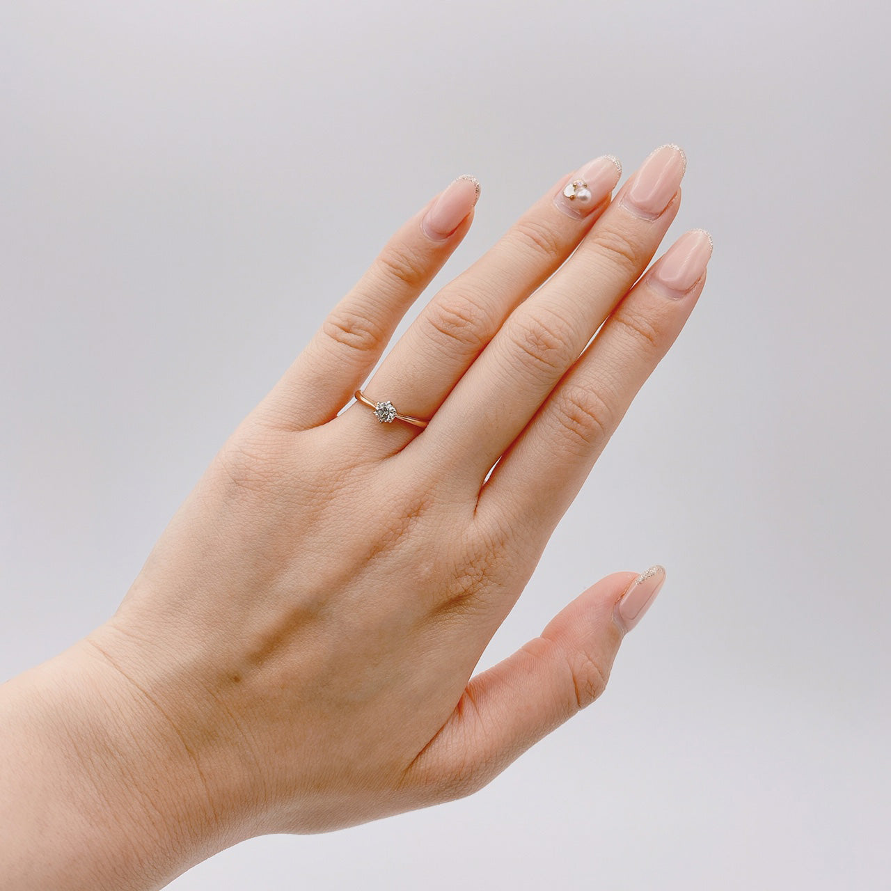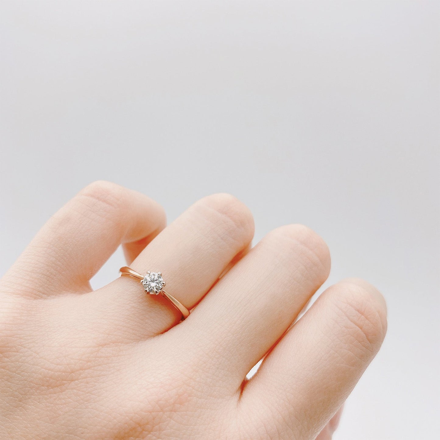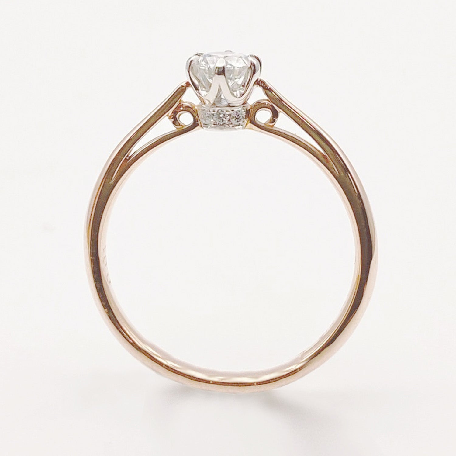 上から見るとシャープで丸みのあるスタンダードなソリテールの婚約指輪で、一見とてもシンプルに見えるのですが、側面から見るととても可愛いデザインが施されているので、さりげなく自分だけのこだわりが演出できる名品です。