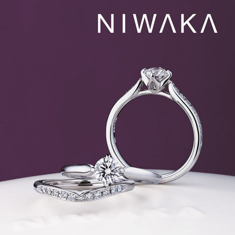千二百年の歴史を持つ京都で誕生したNIWAKA。そこで育まれた感性から生み出されるジュエリーには、世界を魅了する日本の美意識が息づいています。 NIWAKAのすべてのリングにコンセプトと名前があり、それらがリングという小さな世界の中で緻密に表現されています。どの角度から見ても美しいリングのフォルム。洗練されたデザインに存在感ある輝きのダイアモンド。美しく重なる重ね着け。細部までのこだわりは、ハイジュエリーも手がけるジュエラーとしての誇りです。ふたりの描く未来と重ねながら、特別なリングを見つけて下さい。